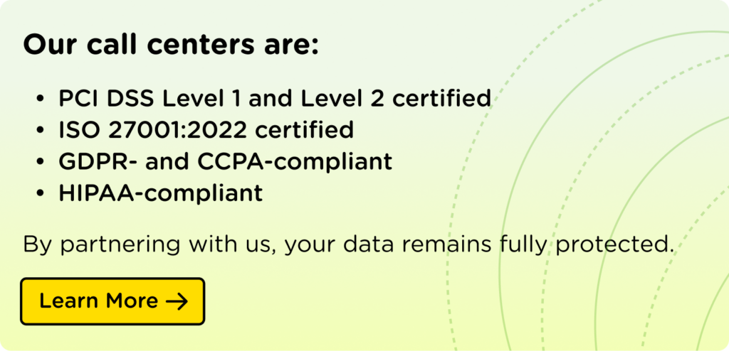 But here’s the good news: outsourcing to an experienced PCI-compliant call center provider protects you from catastrophic financial, operational, and reputational damage while keeping customer interactions smooth. The right outsourcing provider becomes your security partner, not just a vendor.